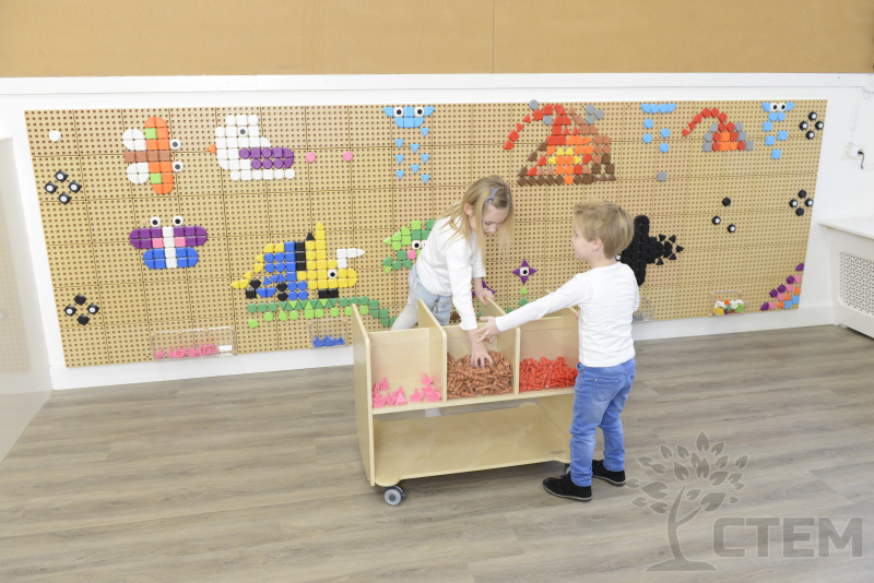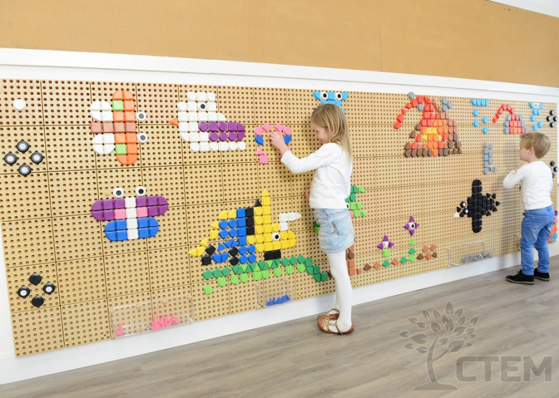 Игровой набор является дополнением к STEM стене, состоит и 256 деталей разных цветов, представлены в виде 4 геометрических фигур (квадрата, круга, треугольника, квадранта). На тыльной стороне фигур расположен штифт, при помощи которого производится крепление к панелям (Стем стены). Цветовая гамма: 8 основных цветов (коричневый, голубой, розовый, зеленый, серый, светло-коричневый, черный, белый) и 2 комбинированных (белый, черный) с точкой по центру.